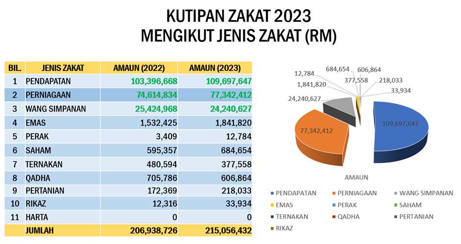 Penyumbang terbesar bayaran zakat harta adalah daripada zakat pendapatan dan sumbangan daripada hasil potongan gaji penjawat awam dan swasta. Sebanyak RM109.7 juta telah diterima melalui kategori zakat pendapatan dengan bilangan pembayar seramai 83,370 orang. Amaun kedua terbesar adalah diterima daripada kategori zakat perniagaan yang meliputi badan-badan korporat serta lain-lain perniagaan. Jumlah yang diterima daripada kategori ini adalah sebanyak RM77.3 juta. Seterusnya diikuti dengan kategori zakat Wang Simpanan dengan jumlah sebanyak RM24.2 juta.