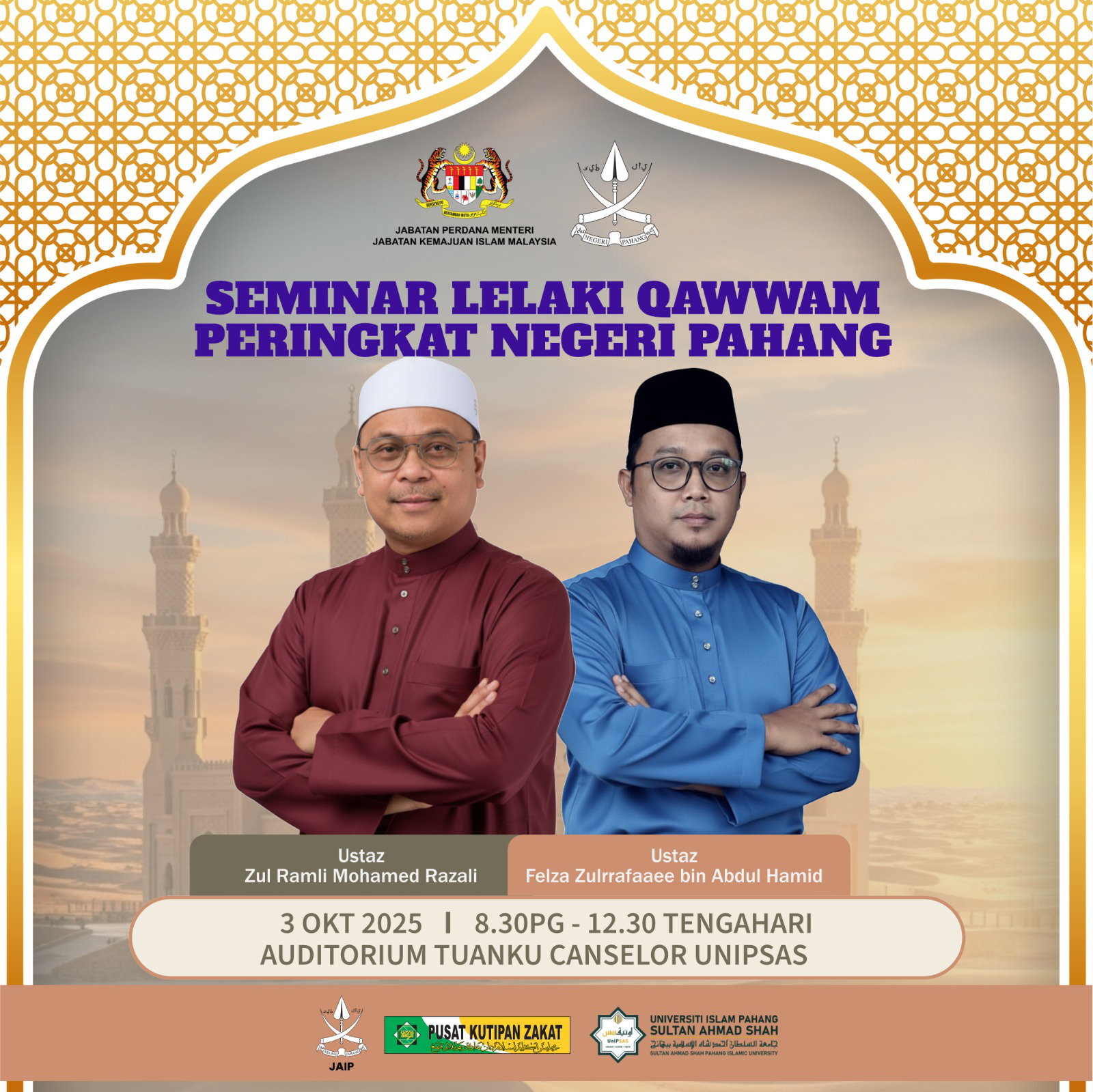 KUANTAN, 3 Oktober 2025 / 11 RABIULAKHIR 1447H – Pusat Kutipan Zakat Pahang melalui Bahagian Dakwah dengan kolaborasi Jabatan Agama Islam Pahang (JAIP), Bahagian KSK JAKIM, serta Universiti Islam Pahang Sultan Ahmad Shah (UnIPSAS), telah menganjurkan Seminar Lelaki Qawwam Peringkat Negeri Pahang 2025 bertempat di Auditorium Tuanku Canselor, UnIPSAS.